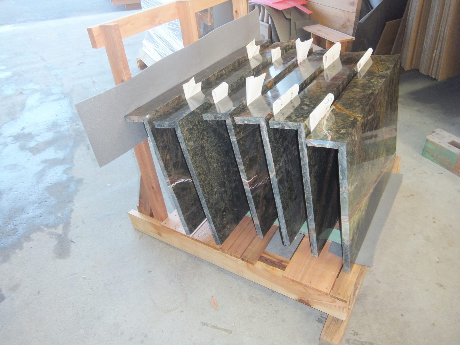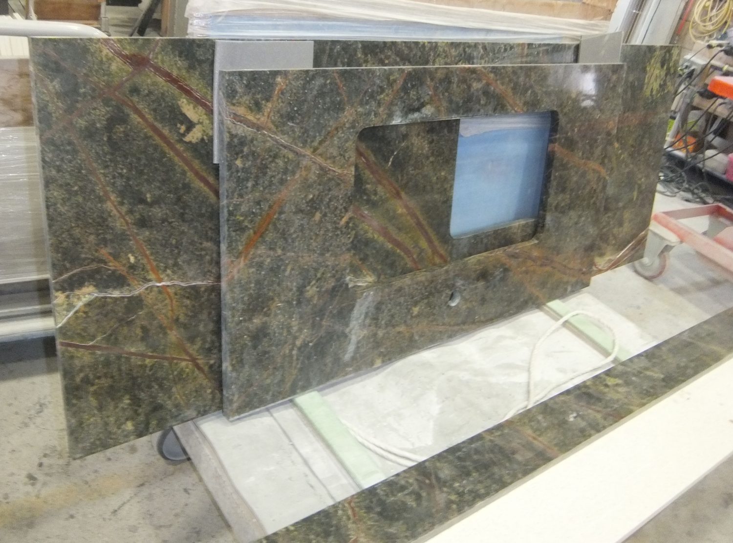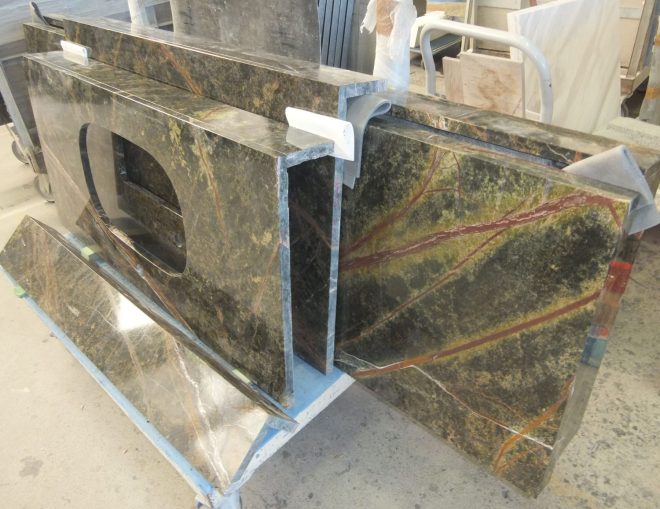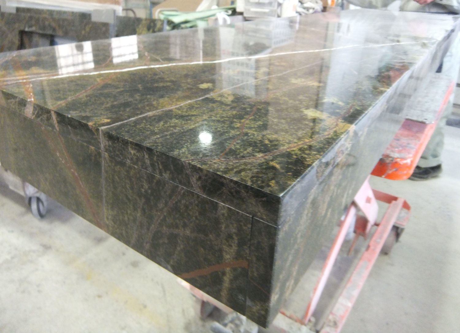 今日の工場では、希少な大理石『レインフォレストグリーン』を使用した