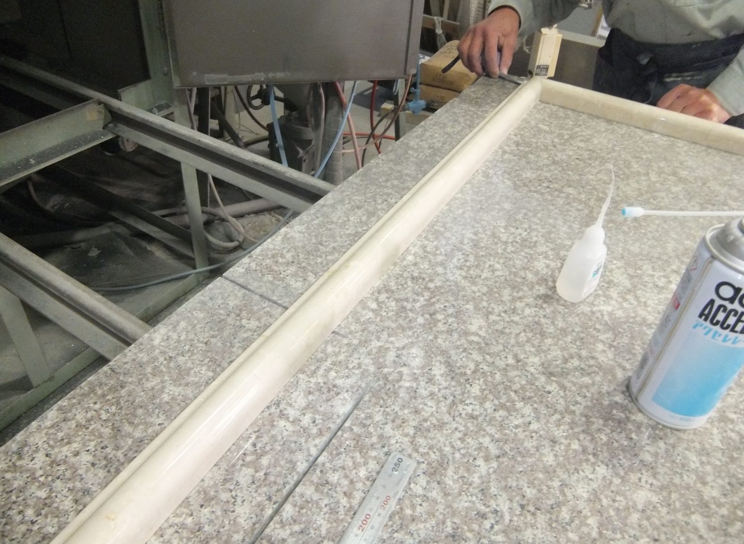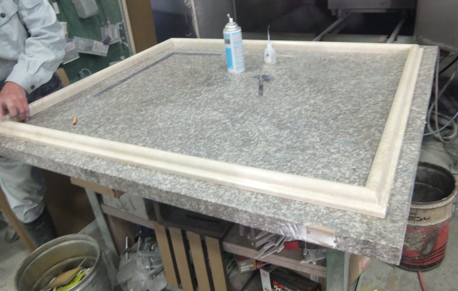 今日の工場では、大理石で窓枠の制作をしていました。