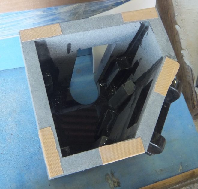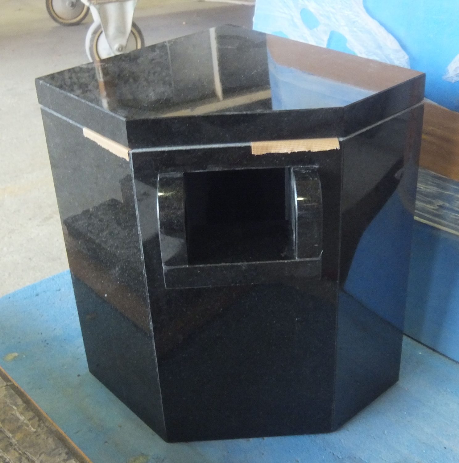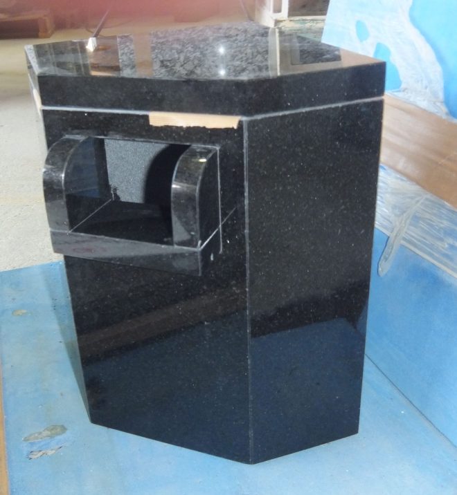 今日の工場では、山西黒(さんせいくろ)御影石を使用した吐水口(とすいこう)の製作をしていました。